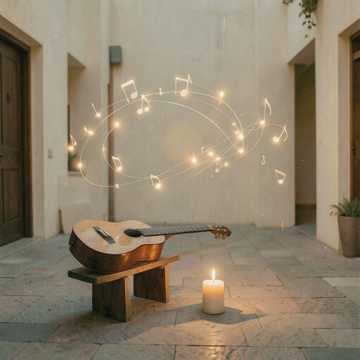 Warm acoustic Arab pop ballad, male vocals. Oud and nylon-string guitar carry a gentle sway with subtle percussion and soft bass. Verse stays intimate and close-mic’d; chorus opens with lifted melody and lush backing “ahh” harmonies. Light strings bloom on the second chorus, ending on a held, hopeful unison note.