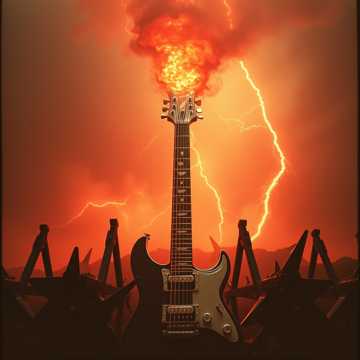 Aggressive Scandinavian hard rock instrumental, 60-second blast. Double-time drums, chugging low-tuned guitars and sharp pinch harmonics. Start with a unison riff that drops into a stomping groove, then a climbing pre-break pattern that explodes into a faster, chaotic final riff. Tight palm-mutes, squealing bends, and a short harmonized lead to peak the energy before an abrupt cutoff.