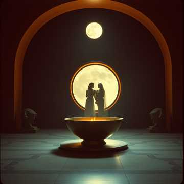 Inmitten der nicht enden mögenden Hochzeitspalasthalle war eine riesige runde Feuerschale so breit wie zwanzig Mann und so hoch daß man gerade noch mit langen Dochtstangen Feuer schöpfen kann und stand auf sieben massiven Lamassu Bronzestieren mit Flügeln und Menschenköpfen darauf; dies war die ewige Flamme der Unsterblichkeit und der Reinheit des Lichts ihres Gottes Ahoorah Masdah das ewiglich leuchten mag; es waren hunderte von Bronzenen Stier Tischchen aufgestellt mit pflückfrischen Feigen Granatäpfeln Datteln Trauben in allen Farben von rotrosa purpurfarben bis tiefrot dunkelblau, fruchtig hell und dunkelgrün und helles Zitronen gelb dabei und reichlich getrocknet und gezuckert kandierte Früchte,Nüsse und Hülsenfrüchte in allen Farben und Formen, ein wahrer Augenschmaus und Gerste Weizen Reis in vielen verschiedenen Größen und Sorten; Wild, Geflügel, Rind und Schaf und Ziegenlammfleisch war auch dabei und sogar die Besten Stücke vom Kamehl und die fettigen Höcker wurden extra für die arabisch Nomaden Reiterkrieger zubereitet; gedörrt, gebraten, geschmort, gekocht; für jeden Gaumen gabs hier einen leckeren Schmaus; Gewürze in hellem gelb bis rot in allen Farben; Safran und Honig als Sohße auf Fladenbrot mit oder ohne Beilage und süßer Traubensaft wie Wein; weiß und rosarot gossen die Hofdamen ein. Nun endlich kamen die Priester herbei; Mihrimah und Rostam waren ganz in schlichtem weiß gekleidet; der Segen ward gesprochen die rechten Hände des Paares wurden ineinander gelegt und siebenmal mit einem rohen Baumwollfaden umwickelt der auch die Stühle umrundet; danach warfen sich Braut und Bräutigam Reis und Goldene Münzen über die Schulter; danach teilte das Paar Brot und Salz aus einer Schale; die Mutter der Braut bedeckt den Kopf der Braut mit Weiß, um sie willkommen zu heißen, und die Braut gibt einen Ring an ein kleines Mädchen weiter; sie sitzen nebeneinander und ein großer polierter Bronzespiegel wird herbeigeführt und das Paar sieht sich das erst mal im Spiegel an und füttern sich gegenseitig Zucker und Honig in den Mund und dann ein erster Kuss und nun sind sie Mann und Frau und und ihre Liebe aufrichtig und groß. Par Aghaba war außer sich vor Freude sie freute sich sosehr für ihr kleines Mädchen