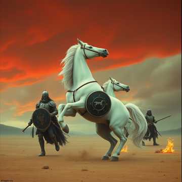 Sein freches Grinsen war sofort fort als sich Rach`sch erhob, auf seinen Hinterfüßen springend war er faßt vier Meter groß dieser weiße Schimmel Der der Götter Bote und der Sterne am unendlichen Firmament leuchtendste Zier, erstrahlte und leuchtete heller als der Polarstern selbst und schnell wie der Wind schon jetzt wurden seine göttlichen Taten in der Heldenlieder der Schahnameh besungen von Persien bis zum unendlichen Ozean. Par Aghaba sah sich beide Pferde genau an