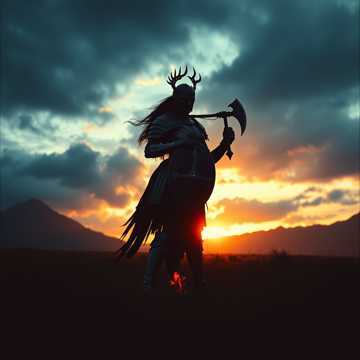 Fast aggressive Viking Folk, Dominant fierce female solo voice, Deep male gravelly background, High-energy driving rhythm, Piercing war flute, Rapid acoustic lute, Massive frame drums, Stomps, 600AD,