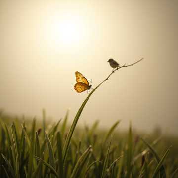В небе солнышко проснулось, Всей полянке улыбнулось. Над цветами, над травой Вьётся бантик золотой! Это бабочка летает, Крылья в небе расправляет!