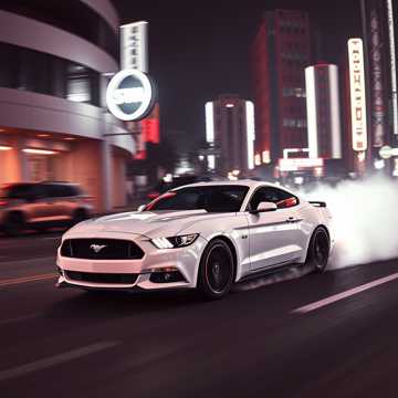 Mustang nocą — błyska felga, dym leci pod niebo,