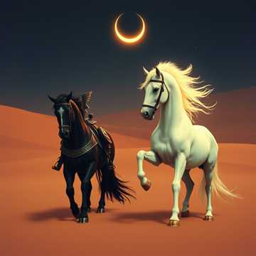 Sein freches Grinsen war sofort fort als sich Rach`sch erhob, auf seinen Hinterfüßen springend war er faßt vier Meter groß dieser weiße Schimmel Der der Götter Bote und der Sterne am unendlichen Firmament leuchtendste Zier, erstrahlte und leuchtete heller als der Polarstern selbst und schnell wie der Wind schon jetzt wurden seine göttlichen Taten in der Heldenlieder der Schahnameh besungen von Persien bis zum unendlichen Ozean. Par Aghaba sah sich beide Pferde genau an
