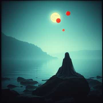 Но вернёмся к Рериха картине женщина с вуалью на лице сидит на камне воды омывают подножие ног а вокруг камни за головой три красные сферы или на рушнике