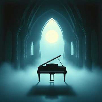 Eerie cinematic Christmas waltz led by resonant piano in a cavernous hall, rich with long tails of reverb and glassy high-register dissonances. Slow 3/4 pulse with subtle bell textures, reversed swells, and low bowed bass notes creating tension. Harmony leans into haunting clusters and unexpected modulations, opening slightly on the main motif before sinking back into mystery., magical
