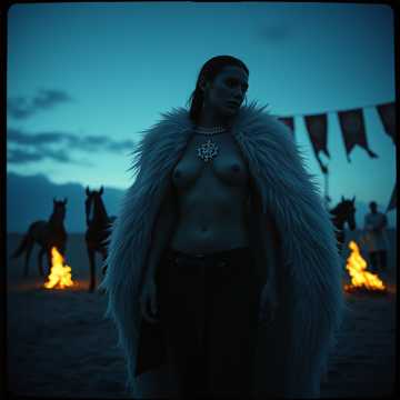 Die Kinna Getschesi begann: Es ward düster, unheimlich, still und fast tödlich leise. Nur eine kleine Schafsfettfackel flackerte im Zwielicht am Jurteneingang der fest verschlossen ward. Asena die Wölfin kniete vor einer Opferglut und beugte sich langsam nach vorn und sprach die magischen Schutzworte über des Brandkreises Glutes Rund und warf die Heilgen Hölzer und getrockneten Kräuter und Beeren, Tollkirschen, Hammeltalg und ätherischen Wurzeln hinein. Sie war völlig nackt; von einem riesigen Wolfsfell bedeckt dessen grausiger Wolfskopf mächtig und groß; gierig nach Menschenblut dürstend seine Teufelsfratze erhob und sich wieder senkte wenn sie ihr Arme gen Himmel erhob die Geistwesen zu rufen und ihre Ahnen kommen sollten sie besuchen in des magischen Zirkels Rund; sie beugte sich nach vorn legte die Arme nach hinten an; des Adlers Greifes Schwingen sind in des Todes Sturzflug. Die Priester und Schamanen Frau`n hoben langsam den heiligen Wolfshautmantel ab und sie richtete ihren Oberkörper auf und begannen die ekstatischen, summend, flehend Tränen und Klage Gesänge. Ein großer Hirschbock wurde am Führstrick hereingeführt und ihm blitzschnell mit dem Opfermesser die Kehle durchgeschnitten. Die Priesterinnen fingen das Blut des Opfertiers in einer Schale auf und strichen heilige Zeichen und Schutzsymbole auf ihre Haut. In des Hirschbocks Blut gaben sie Indigo und rote Stachelbeere und viel schwarzen Tee und bemalten ihre Arme, Hände, Brust und Rücken und ihre Oberschenkel die wohlgeformt, geschmeidig glänzten.