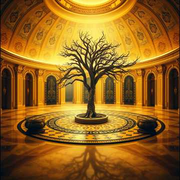 Die riesige runde Innenhalle ward vollständig mit Gold Plättchen bedeckt und in der Mitte der riesigen Kuppelhalle stand ein zwanzig Meter breiter runder Grillrost auf dem Tag und Nacht Fleisch geschmort, gebraten, gegrillt, gekocht, gedörrt, geräuchert wurde; und es zischte, rauchte, schmauchte, fauchte nur so das köstlich duftend Fleisch und Tomaten, Auberginen, Paprika, Peperoni, Chilis, Linsen, Bohnen, Hirse, Reis und Weizen; Hülsenfrüchte und sogar Granatäpfel, Zitrusfrüchte und aller Arten von Nüssen, Mandeln gebrannt, gegrillt, kandiert, gezuckert, geräuchert, gekocht gaben einen betörenden orientalischen Duft von eintausend und einer Nacht wie auf dem der Welt größten Basar in des Himmels Kuppels Halle ab. Am kreisrunden Eingansrund der riesigen Kuppelhalle stand ein aus reinstem Silber geschlagener, gedrehter, geschmiedeter, heiß gelöteter, feinst ziselierter, modellierter, reich verzierter Silberner Blätter Baum dessen Arme, Äste, Blätter, Zweige, Knospen, Knollen, schlanken Ranken sich bis in des Kuppel Himmels Decke empor rankten, verdrehten, verzahnten, verflochten, umrollten und nicht aufhören wollten zu funkeln und zu gleißen, schimmern und zu leuchten. Und zu guter Letzt auch noch der besten und edelster Trunke in sich trug und aus vier Schlangen Mäulern edelsten Traubenwein, Boal Honigmeht, feinstes vergorenes Stutenmilch Ai`rag und auch noch Terra` sina Reiswein aus der silbern Schlangen Mäulern spieh. Yu`Yi, Ulü Schelunn Khann saß auf seinem golden Thron der gen Norden zeigte und empfing Par Aghaba und seine Gäst. Ich bin Par Aghaba die Feder des Adlers und wenn der Skythen Greife ihre Flügel in der Steppe Höhen schwingen wird bald des Todes Lied erklingen.Par Aghaba und Bulba Kahn Par Aghaba und Bulba Kahn