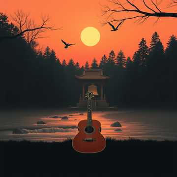 acoustic with only guitar, warm and meditative, deep voice, vocal delivery is emotive and reverent, temple bells, temple music; may include some nature sounds like water and birds