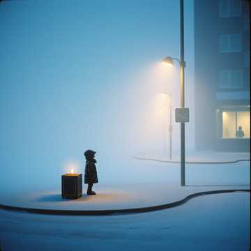 Styl: smutna, filmowa muzyka instrumentalna z narracją spoken word, wolne tempo, tonacja molowa, zimowa noc, delikatne smyczki, cichy fortepian. Atmosfera chłodu, śniegu i samotności. Muzyka cicha pod głosem. Głos dziecięcy lub delikatny kobiecy, spokojny, czytany — nie śpiewany.