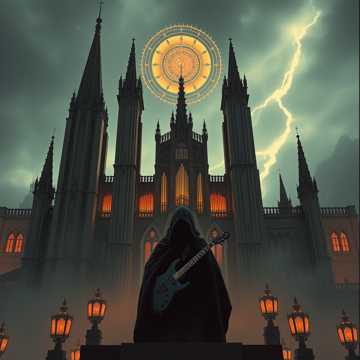 metal, Gothic metal with towering choirs, dual guitars in dropped tuning, and a cathedral pipe-organ foundation. Verses brood in half-time with male vocals, tom-heavy drums, and tolling bells; chorus surges with double-kick, string pads, and stacked harmonies. Bridge leans into a doom-laden riff, whispered backing vocals, and a soaring, dissonant guitar lead before a final, crushing chorus., gothic metal