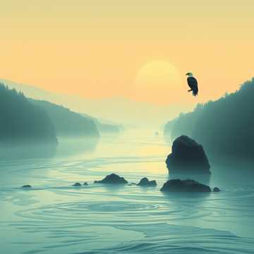 Cinematic ambient score with spacious field recordings: soft river murmur, layered birdsong, distant eagle calls, and airy wind textures. Minimal piano motifs and subtle evolving pads swell and fade like breathing, creating a meditative arc that gently grows in the middle then returns to an intimate hush. Ideal for a patient, atmospheric build that keeps the focus on the natural soundscape.
