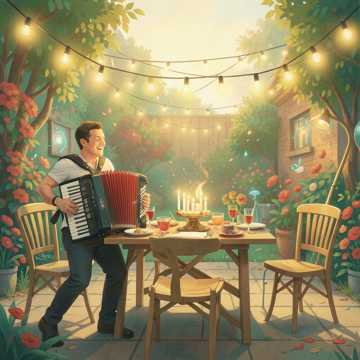 Bouncy party folk-pop, brisk 2-step groove with acoustic guitars, accordion swells, and bright brass hits; male vocals up front, crowd-style gang shouts in the hook; verses keep it storytelling and light, chorus bursts with claps and simple sing-along melody; short breakdown in the bridge with half-time drums before final uplift.